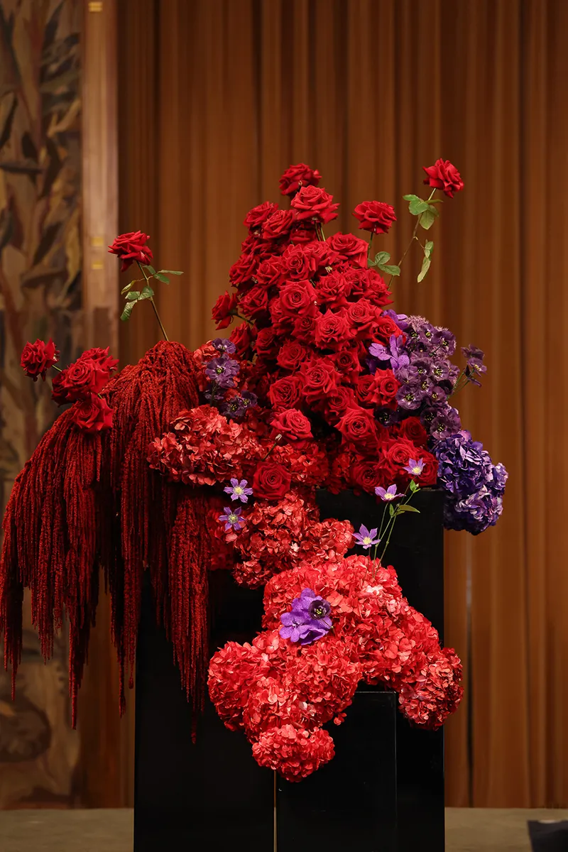 Unaufgeregter Blumenschmuck, das Plakatsujet von Arnulf Rainer und eine junge Debütantin im vollen Ornat